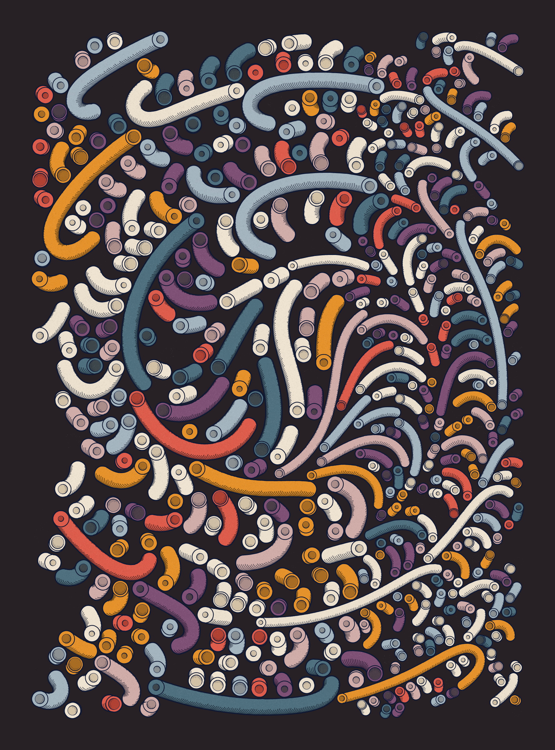 A generative series inspired by childhood memories, play and exploration. The program can use a variety of motions, collision types, colour processes, palettes and scales to create a wide range playful output.