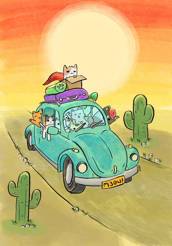 A piece of art of cute kitties on their beetle, traveling the desert to go to the beach and have great time.