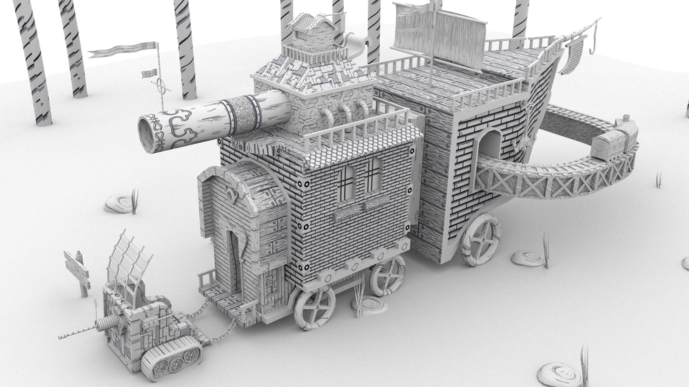 Based on the 2014 original ink work "War Caravan", this new 3-D work recreates and expands the horizons of this fantasy artifact. The object comes to life in its own world of black and white, a world full of adventures. One can imagine traveling well protected from the bandits of unknown lands, also enjoying its diaphanous landscapes and bustling cities.