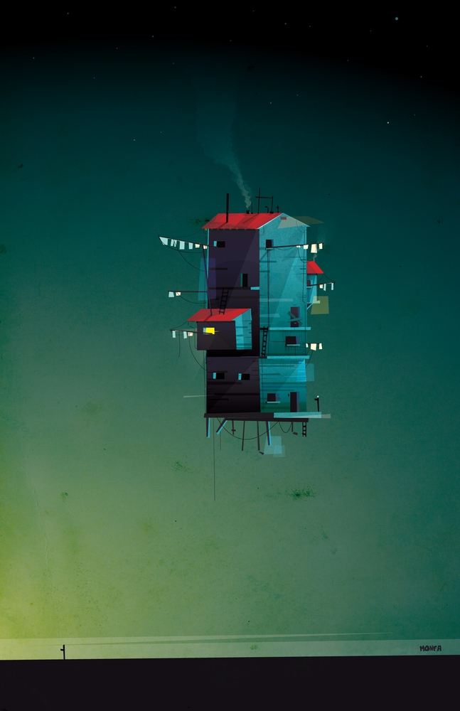 A very personal work, part of the Habitable Structures Collection. A floating home, moving forward without ties. Maybe a memory of other times that slowly follows us, full of life, with people and memories of the past.