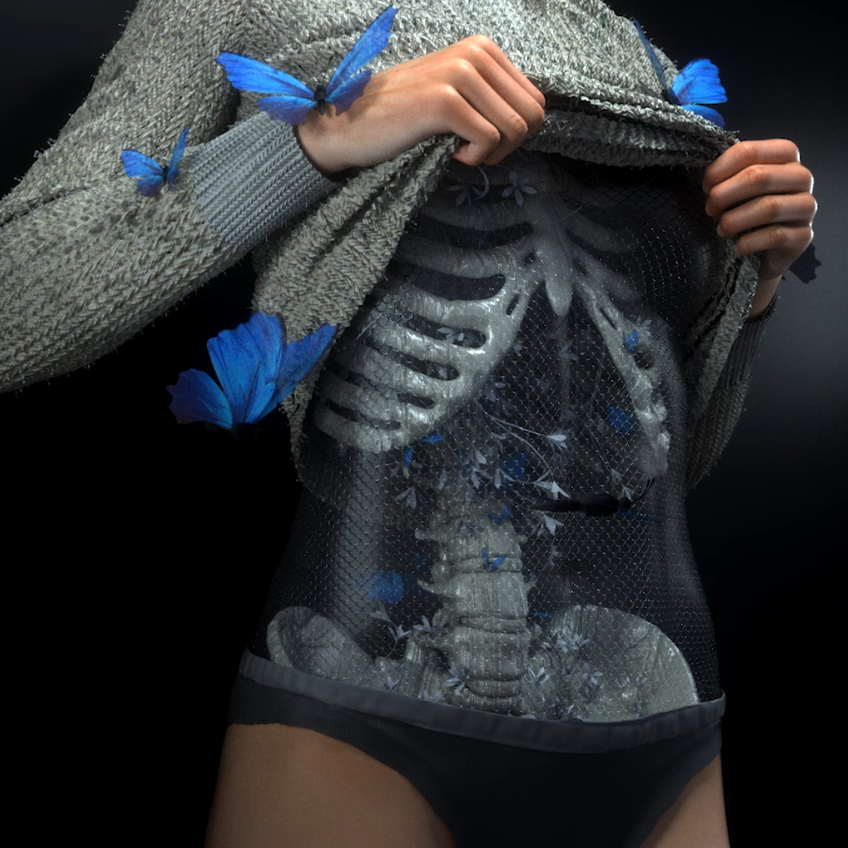 A literal representation of butterflies in your stomach, or maybe it represents a beautiful decay of the human-being when we become one with nature and our bodies decompose.