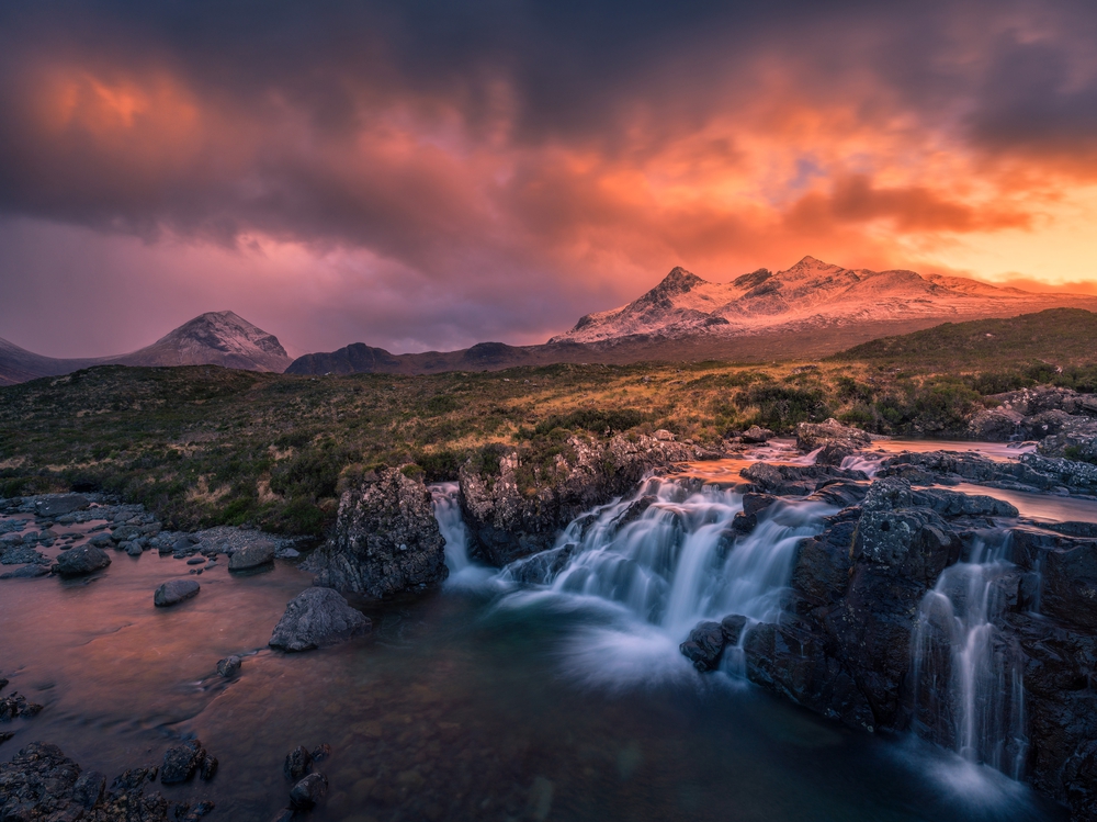 Allt Dearg Mor's waterfalls, set against the beautiful profile of Sgurr Nan Gillean, are one of my favorite locations with any weather and one I love to go back photographing over and over. I started photographing this location in 2009 and I revisited it every year for over a decade, chasing that elusive, perfect combination of weather, water level and light.
