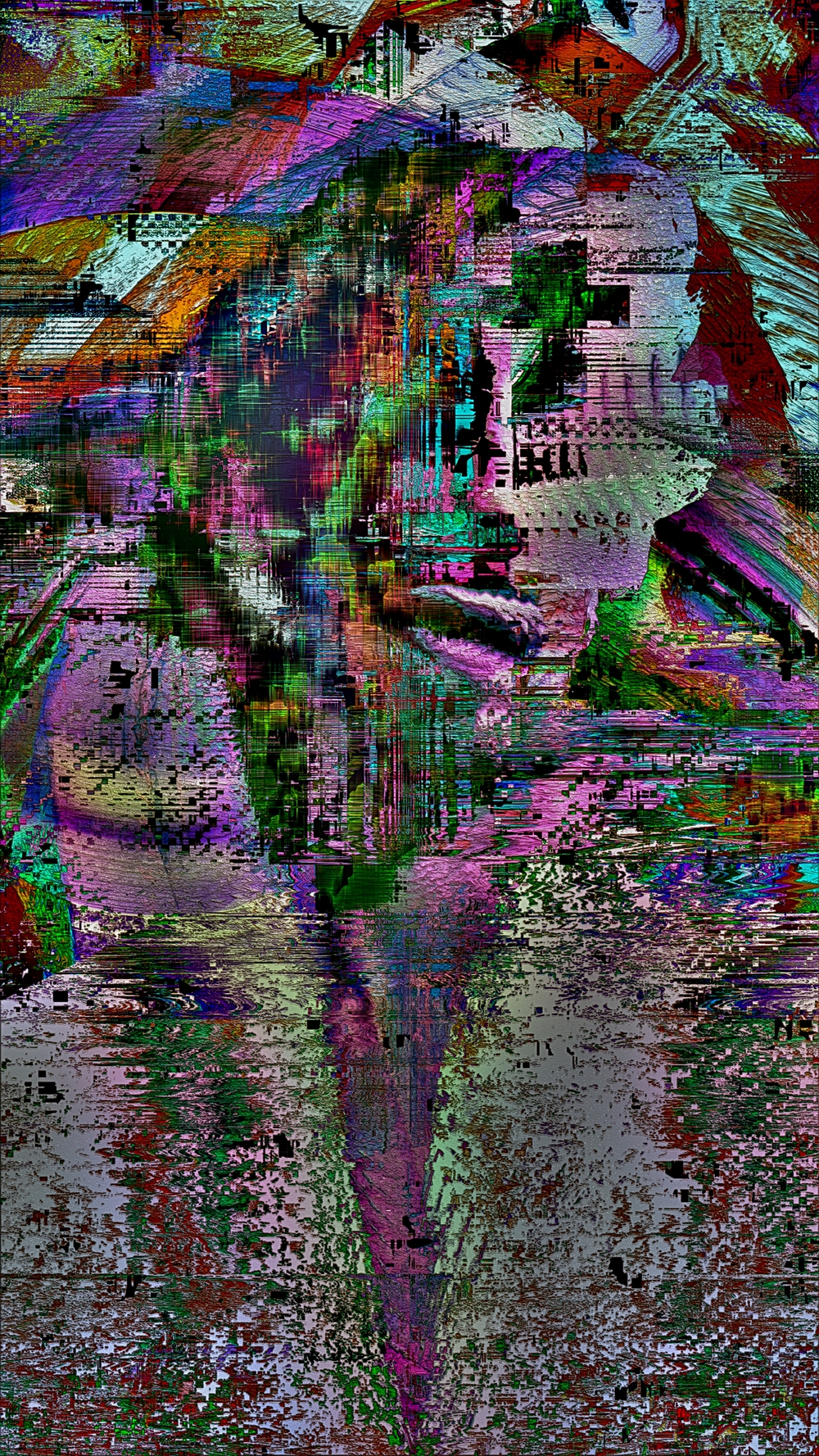 A Glitch Self Portrait : Deep in thought, laying feebly against the wall, disillusioned by the weak fabric acting as a veil of reality surrounding everything, oneself included : Echoing thoughts, layering ever increasingly, looping into infinite patterns of self-doubt and uncertainty : The Universe experiences itself subjectively through all of existence : Yet, a question remains...