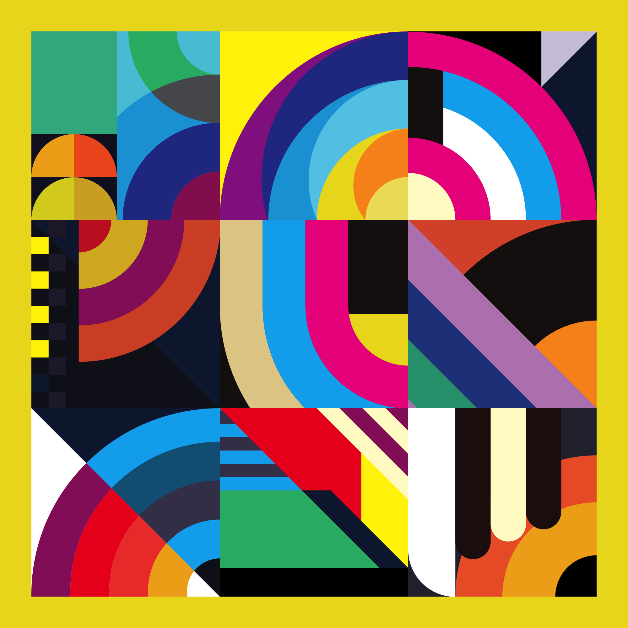 This series of 999 explores the playful relationship between color, shape, line and harmony. Each artwork is a combination of 9 zones (3 rows of 3). Displayed within each of the 9 zones is 1 of 59 possible smaller pieces, which put together makes one large artwork. The zones are programmed in such a way that you will not see any duplicated pieces within any of the zones, thus making each artwork unique and one of a kind.