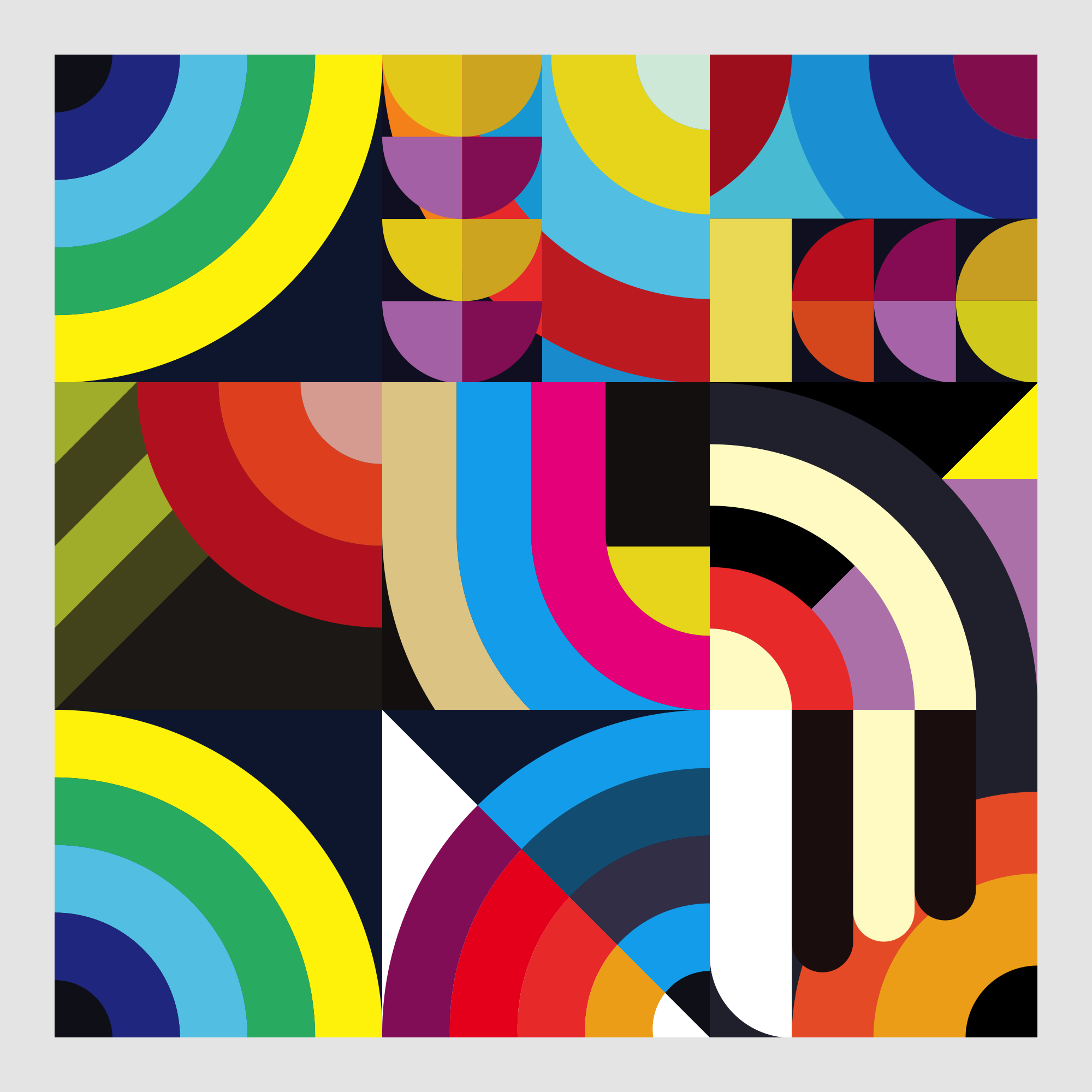 This series of 999 explores the playful relationship between color, shape, line and harmony. Each artwork is a combination of 9 zones (3 rows of 3). Displayed within each of the 9 zones is 1 of 59 possible smaller pieces, which put together makes one large artwork. The zones are programmed in such a way that you will not see any duplicated pieces within any of the zones, thus making each artwork unique and one of a kind.