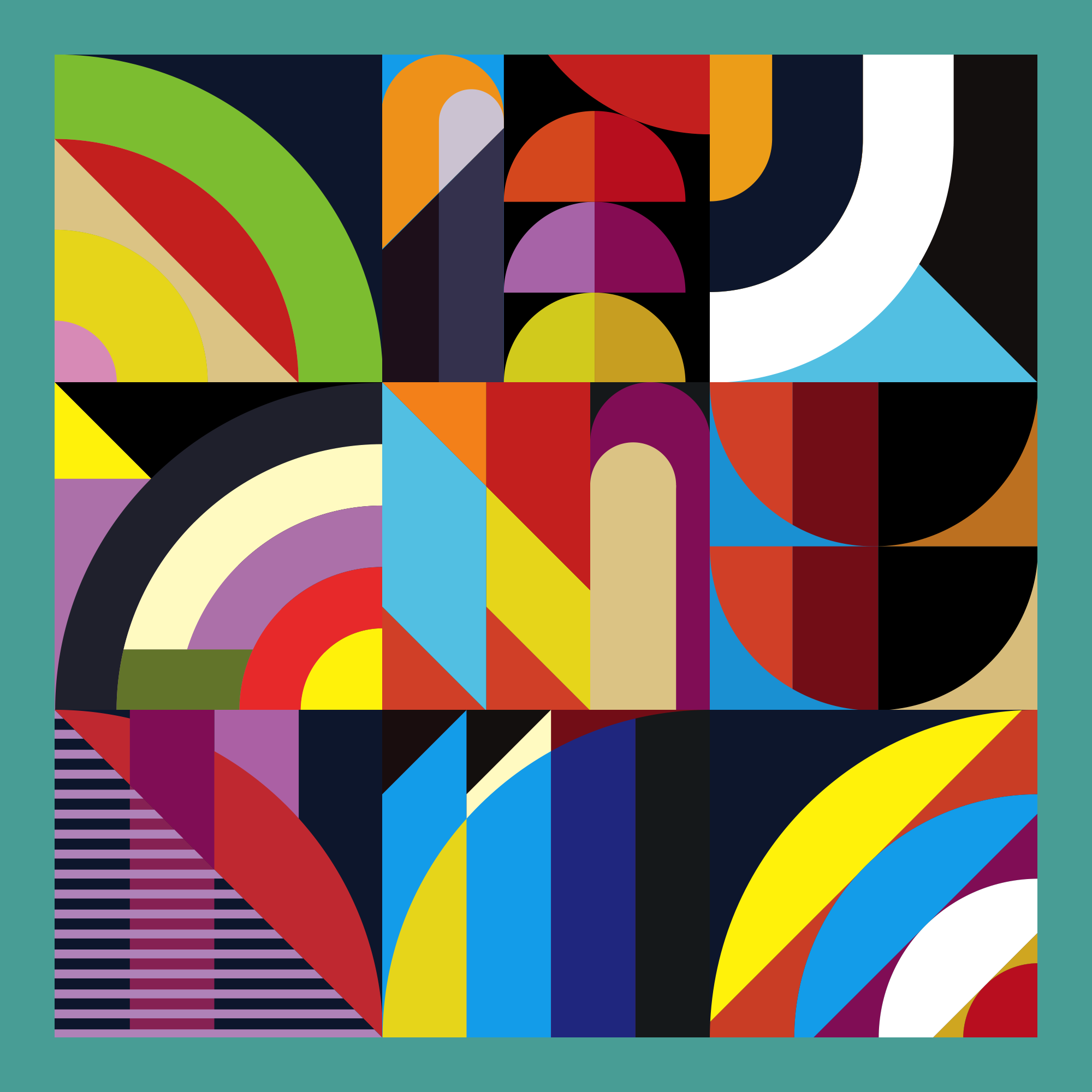 This series of 999 explores the playful relationship between color, shape, line and harmony. Each artwork is a combination of 9 zones (3 rows of 3). Displayed within each of the 9 zones is 1 of 59 possible smaller pieces, which put together makes one large artwork. The zones are programmed in such a way that you will not see any duplicated pieces within any of the zones, thus making each artwork unique and one of a kind.