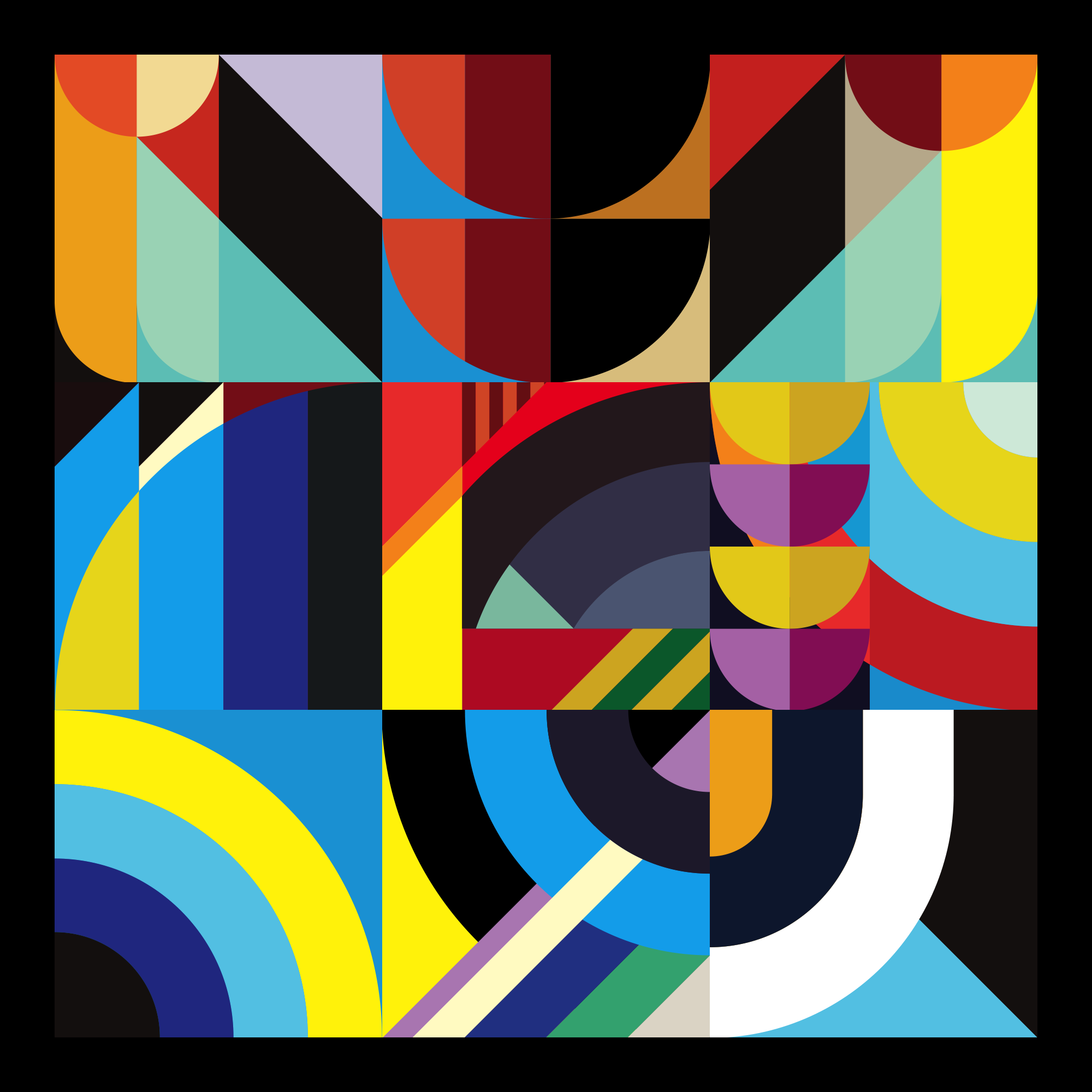 This series of 999 explores the playful relationship between color, shape, line and harmony. Each artwork is a combination of 9 zones (3 rows of 3). Displayed within each of the 9 zones is 1 of 59 possible smaller pieces, which put together makes one large artwork. The zones are programmed in such a way that you will not see any duplicated pieces within any of the zones, thus making each artwork unique and one of a kind.