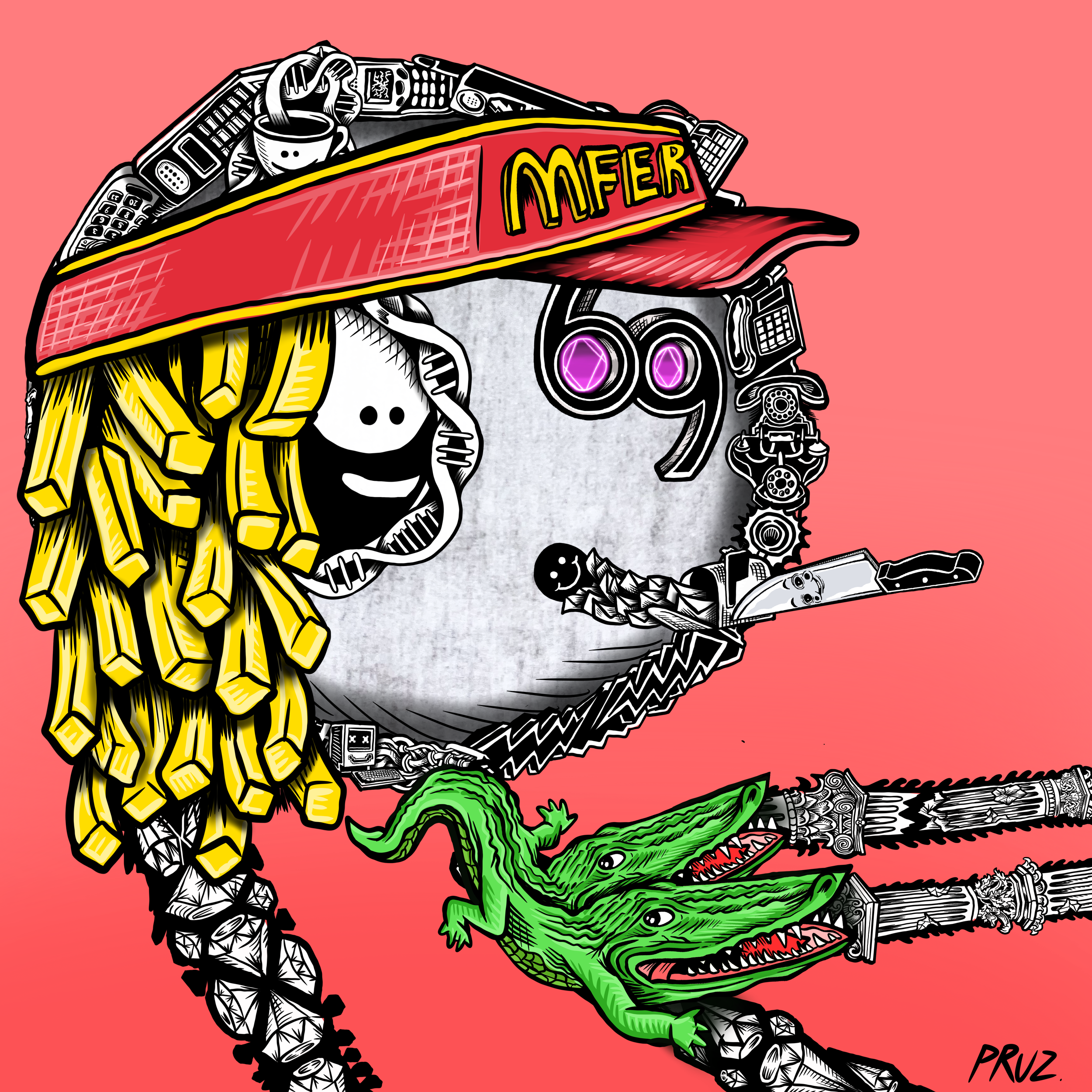 "fine art mfers" is a collection of 4200 hand-drawn degens by renowned artist marlon pruz. a tribute to the og mfers nft, every trait was painstakingly drawn. no matter the rarity, each piece was designed to be a 1 of 1 masterpiece filled with easter eggs, cultural references, and a mind-blowing amount of detail. marlon flips the simplicity of mfers by using them as a template for these high-quality illustrations.