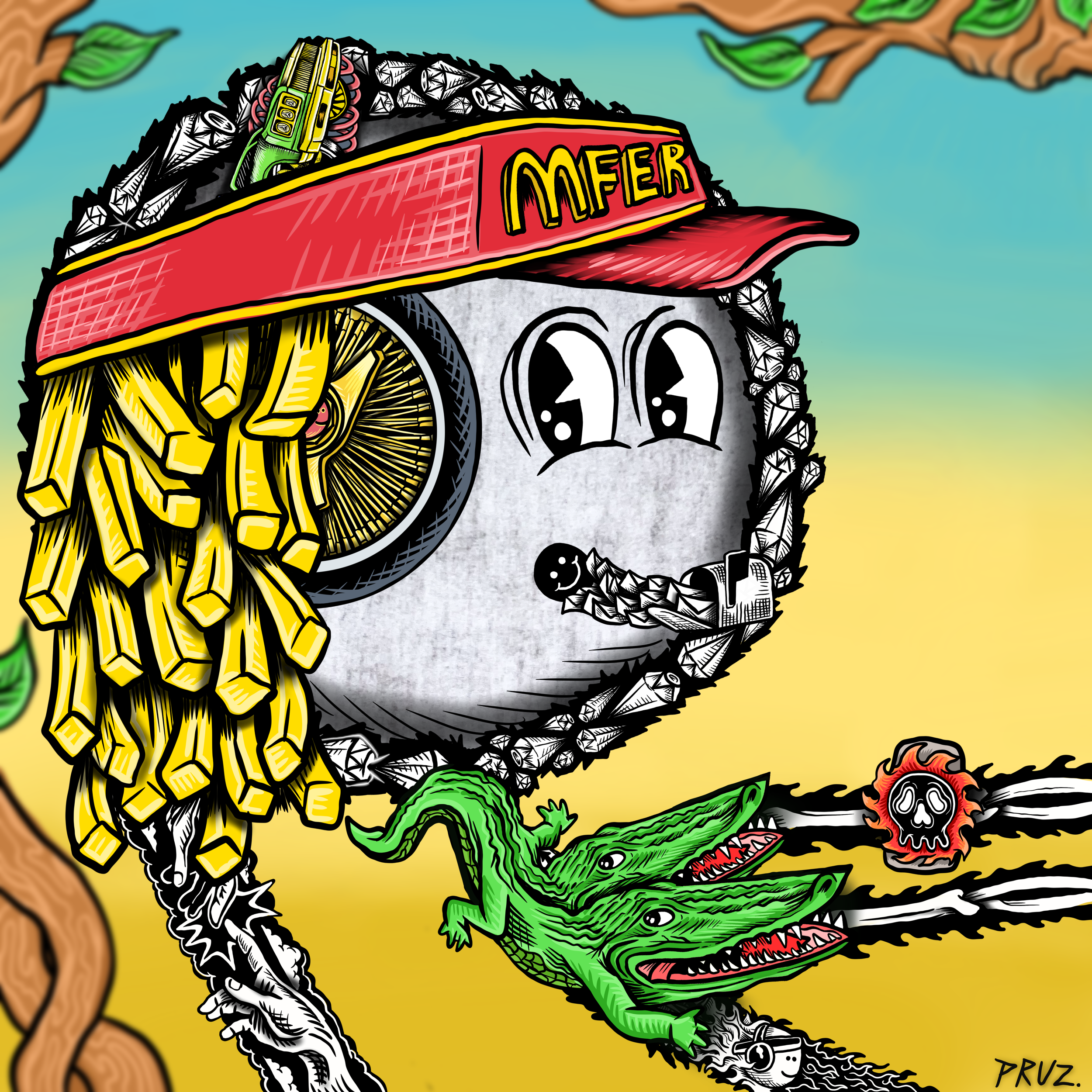 "fine art mfers" is a collection of 4200 hand-drawn degens by renowned artist marlon pruz. a tribute to the og mfers nft, every trait was painstakingly drawn. no matter the rarity, each piece was designed to be a 1 of 1 masterpiece filled with easter eggs, cultural references, and a mind-blowing amount of detail. marlon flips the simplicity of mfers by using them as a template for these high-quality illustrations.